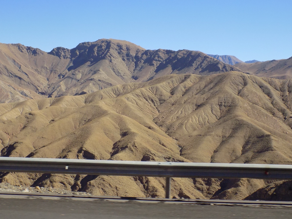 Șoseaua a fost construită de francezi, înlocuind un vechi drum de caravane. Serpentinele se desfășoară una după alta și noi câștigăm altitudine. Muntele e acum gol, fără pic de vegetați și soarele arde tare. După câteva fotografii, făcute în punctul de maximă altitudine, începem să coborâm în zone mai prietenoase, apoi intrăm în Ouarzazate.