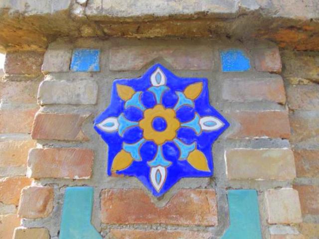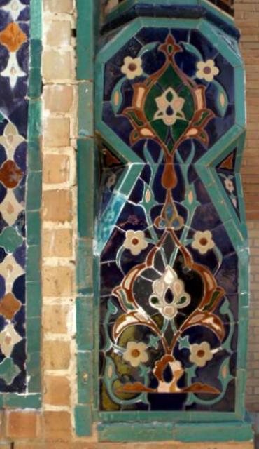 La plecare, in curte, mai admiram o data detaliile de pe fatada mausoleului si a portalului de la intrare. Spre deosebire de alte monumente, aici predomina motivele florale. Ne bucuram ochii cu florite smaltuite fiindca stim ca mai avem doar un singur obiectiv de vizitat: Registanul.